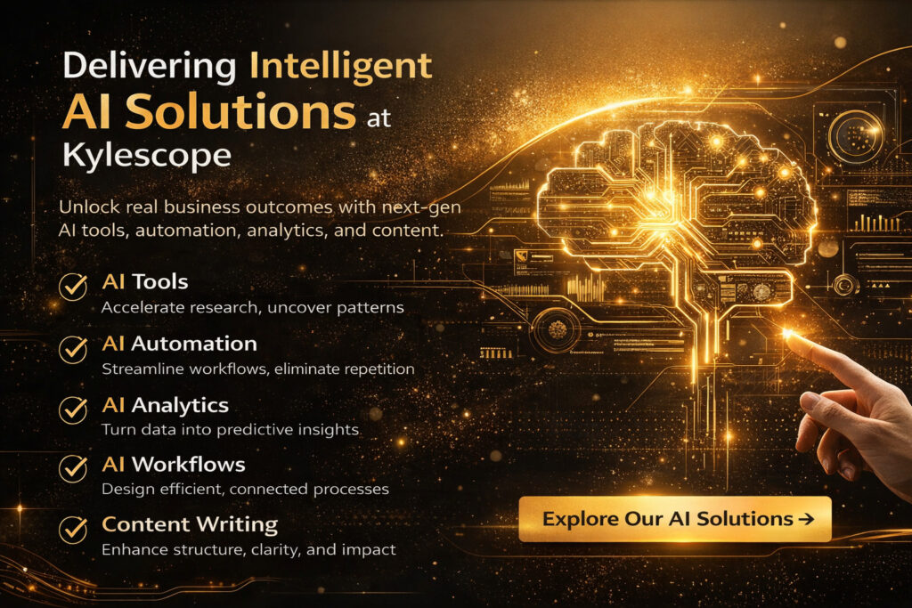 Kylescope bridges the gap between AI theory and real-world execution by delivering practical AI solutions that combine intelligent tools, automation, analytics, connected workflows, and expert content services.